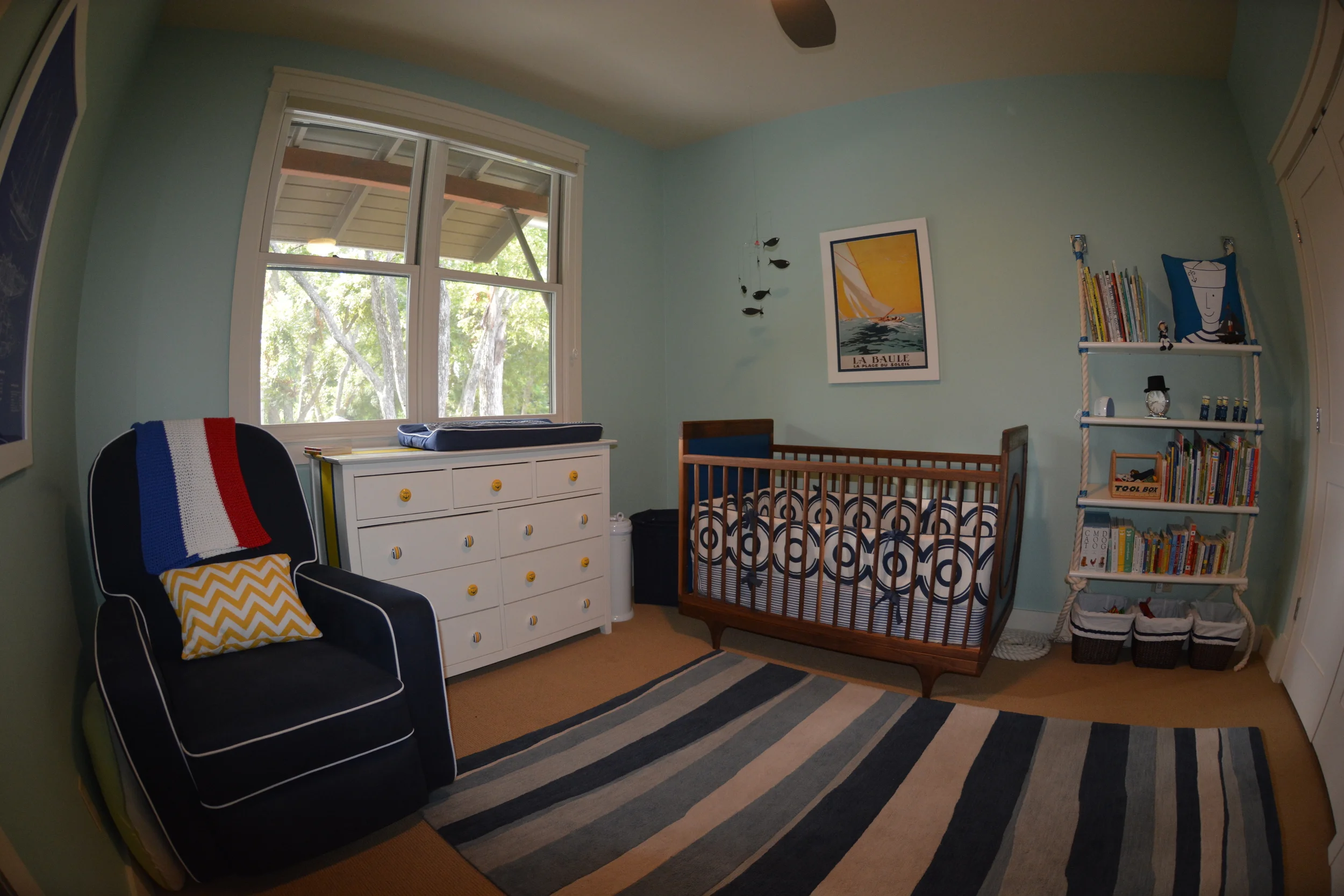 Around 27 weeks, I had a total freak-out moment after reading some article online that said furniture needed to be ordered during the second trimester. And I was now late. Looking back, this was absurd. The baby didn't even spend time in his room until he was 3 months old. The only piece of furniture we used was the dresser to store his more than ample supply of clothing. That weekend was the great nursery hunt. Fortunately, my obsessive self had a very detailed inspiration board, and we were able to purchase or draw up plans for everything in the room in about 3 hours. My husband and I both grew up sailing, so our "nod towards nautical" theme was easy to agree on. Here's a fish-eye view of the result: