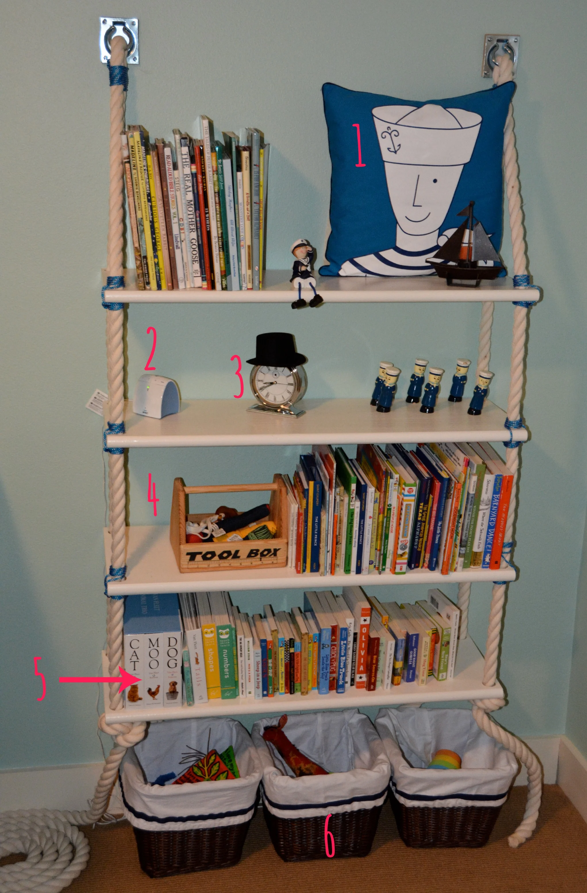 The rope on the bookcase adds a fun twist without being too kitschy.
