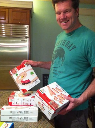 I recently ordered a (rather large) stash of PlanToys wooden train track sets for Robert. After opening the shipping box, Jon looked at one of the pictures and exclaimed, "They have a drawbridge! Oh my god we need the drawbridge!"